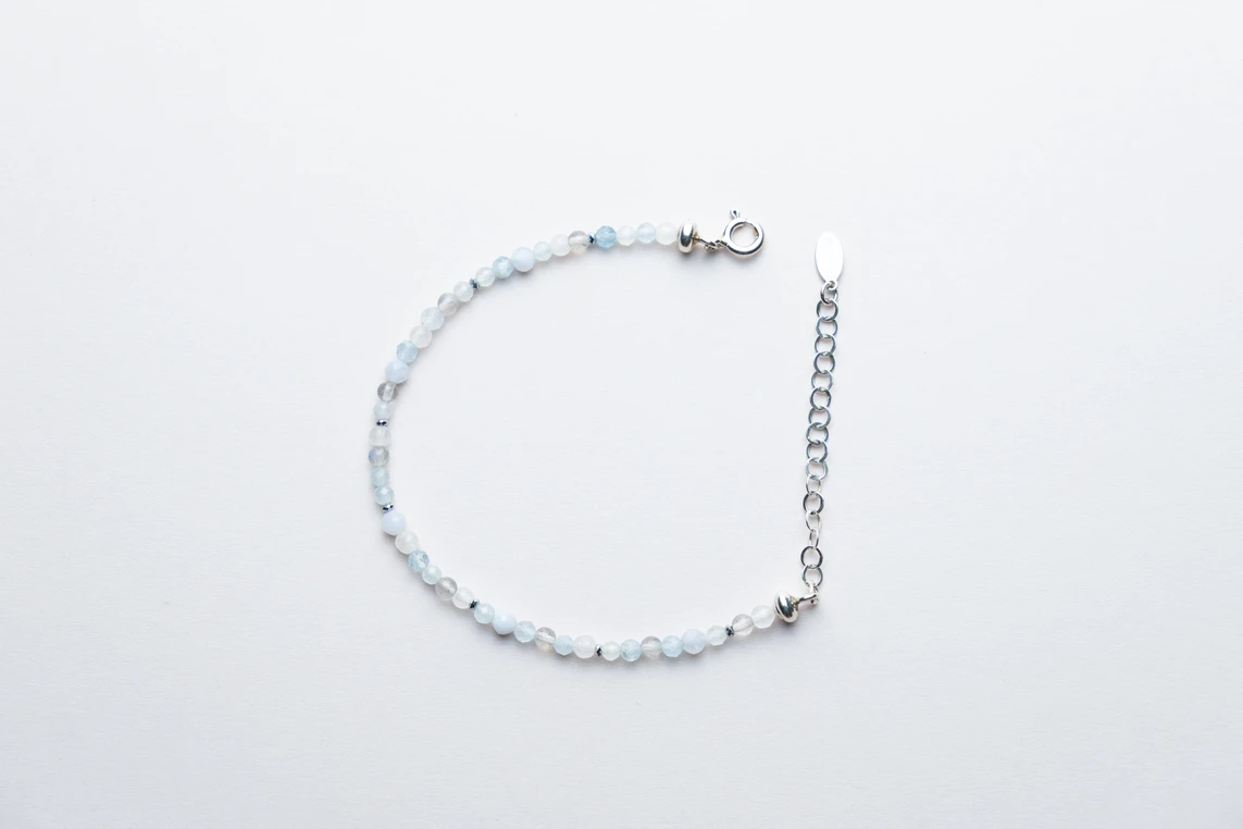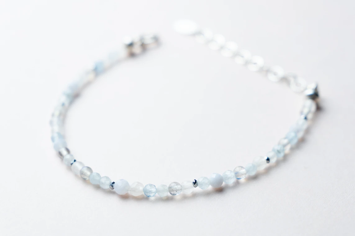 Bransoletka „Źródło Ciszy” z akwamarynu, chalcedonu, jadeitu, labradorytu i hematytu wspiera spokój, duchową równowagę i kontakt z intuicją.