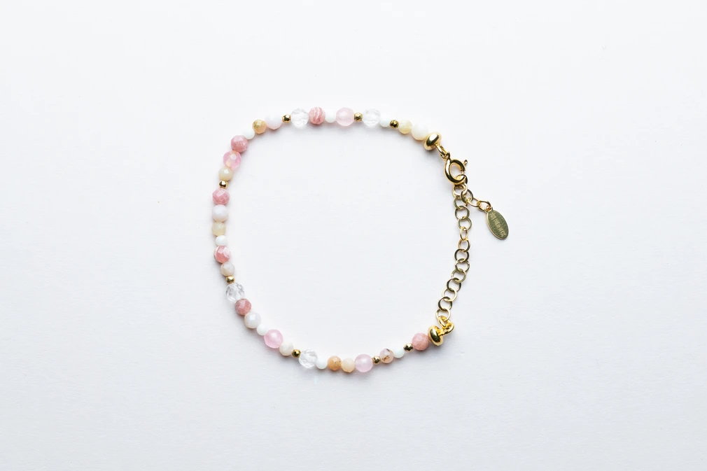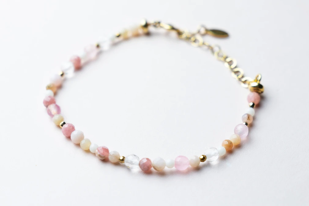 Bransoletka „Dotyk Czułości” to połączenie rodochrozytu, kryształu górskiego, korala białego, opalu różowego, jadeitu i hematytu. Niesie w sobie delikatność, spokój i wewnętrzne ukojenie.