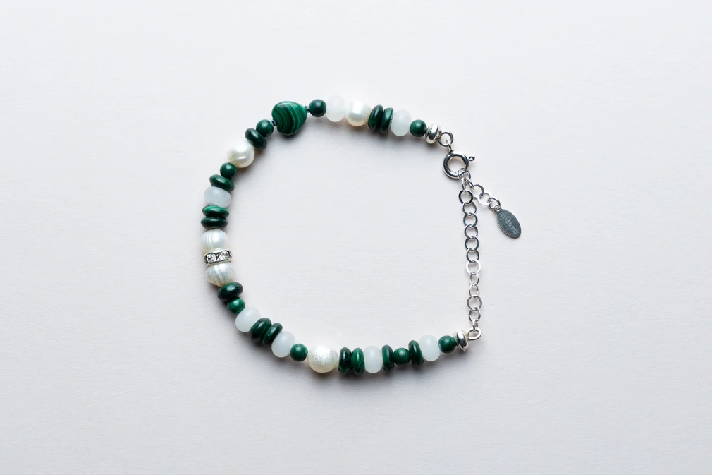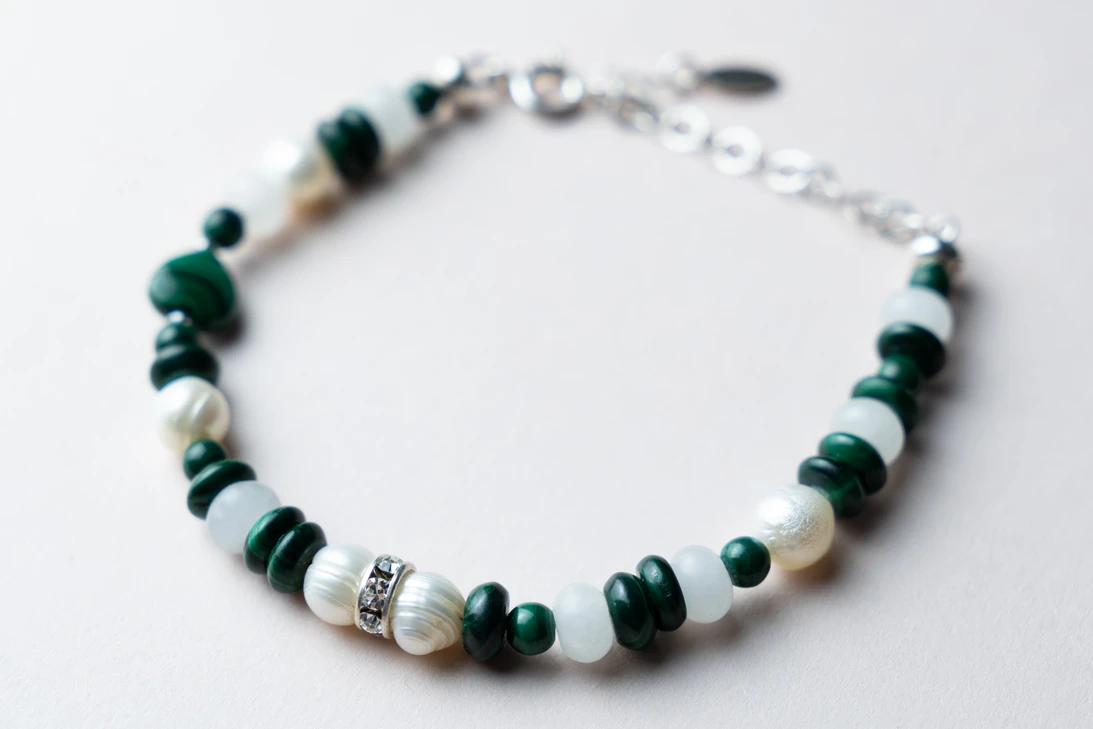 Bransoletka „Serce Malachitu” to połączenie malachitu, pereł, kwarcu i hematytu – talizman przemiany, ochrony i harmonii.