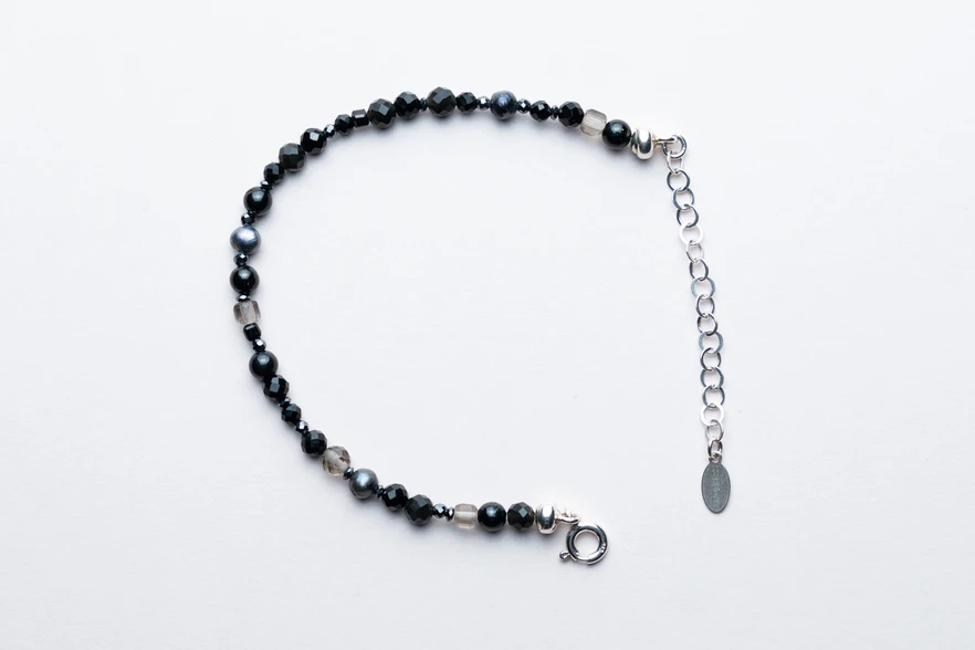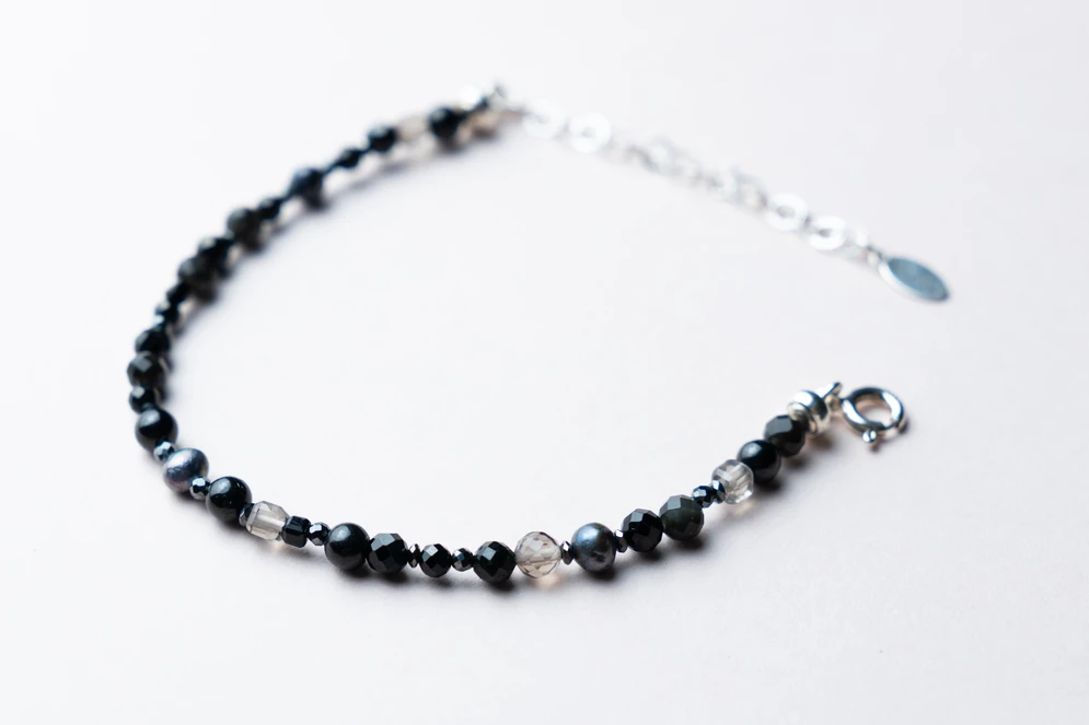 Bransoletka „Moc Cieni” to kompozycja obsydianu, turmalinu, perły, hematytu, kwarcu dymnego i spinelu. Talizman ochrony, uziemienia i wewnętrznej siły.