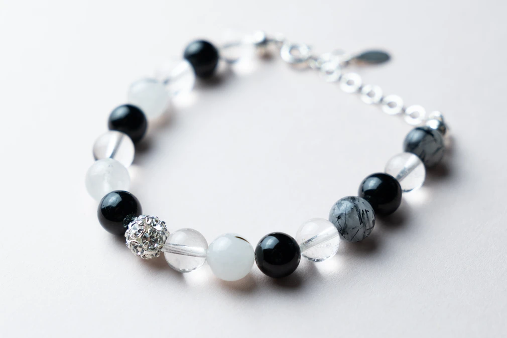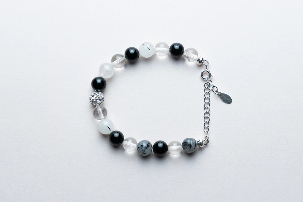 Bransoletka „Czarna Mądrość” to połączenie turmalinu, kryształu górskiego i kryształu z turmalinem. Symbolizuje ochronę, jasność i siłę wewnętrzną.