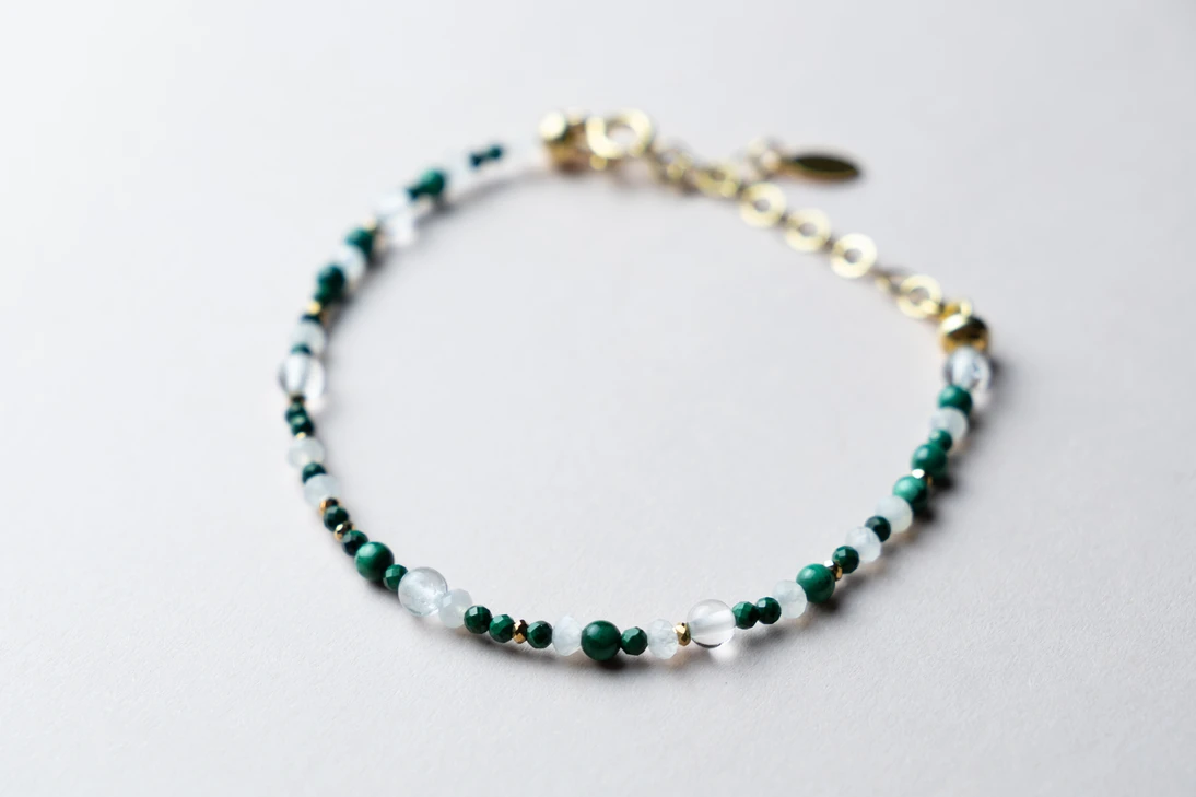 Bransoletka „Księżycowa Zieleń” z malachitem, topazem, kamieniem księżycowym i hematytem – talizman ochrony, transformacji i intuicyjnego prowadzenia.