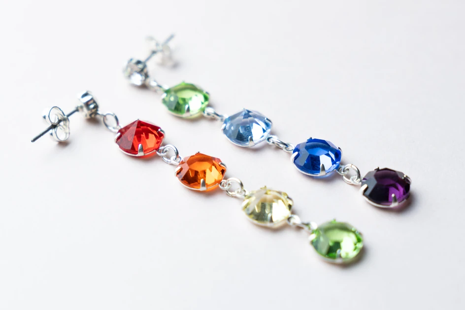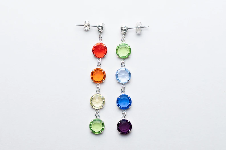 Kolczyki „7 Kryształów Mocy” z podwójną zielenią – harmonijna biżuteria energetyczna w kolorach czakr, ze wzmocnieniem czakry serca.