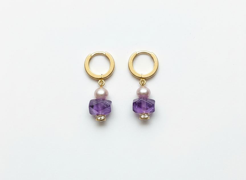 Kolczyki „Dotyk Magii” z perłą, ametystem i ozdobnymi kryształkami – talizman kobiecej intuicji, duchowego światła i subtelnego piękna.
