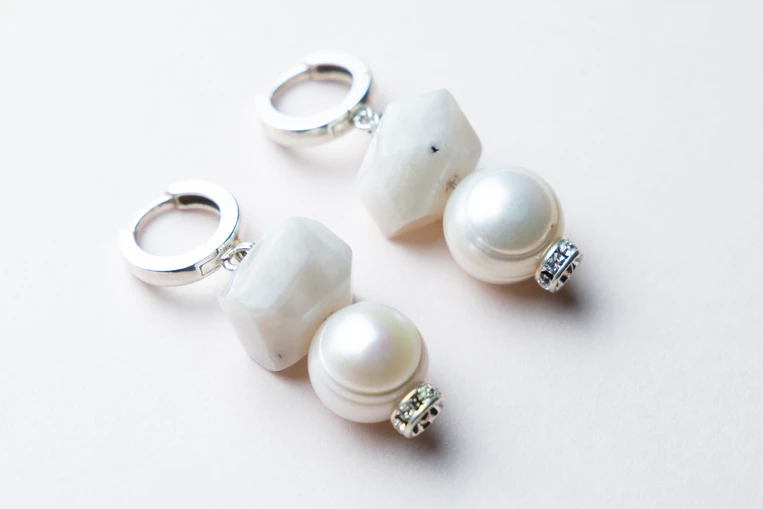 Kolczyki „Księżycowa Elegancja” to połączenie kamienia księżycowego, perły i elementów ozdobnych w kolorze srebrnym z kryształkami. Talizman kobiecej siły i intuicji.