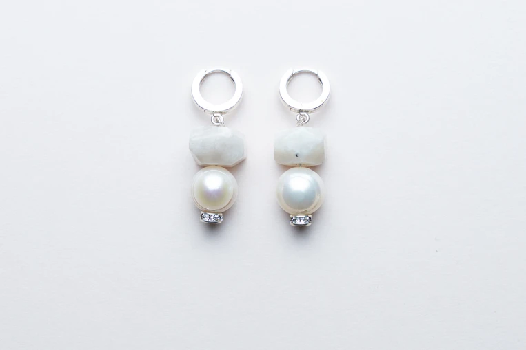 Te subtelne kolczyki łączą w sobie mistyczny blask kamienia księżycowego z delikatną perłą, tworząc kompozycję pełną spokoju, klasy i kobiecej siły. Ich forma przyciąga uwagę miękkim światłem, które towarzyszy w codziennych rytuałach i wyjątkowych chwilach.