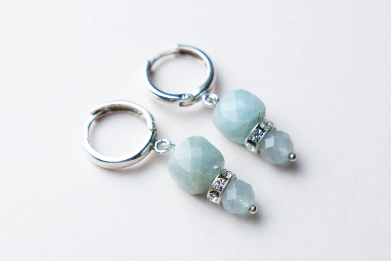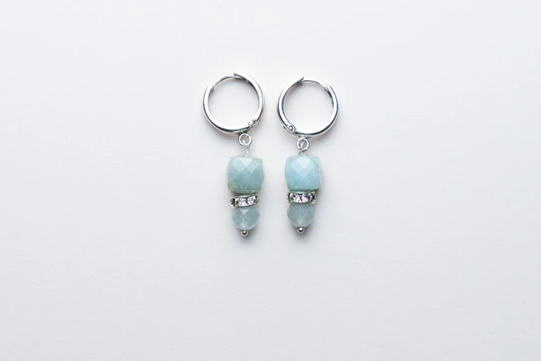 Kolczyki „Szepczące Fale” to połączenie akwamarynu i elementów ozdobnych w kolorze srebrnym z kryształkami. Talizman spokoju, lekkości i łagodnej komunikacji.