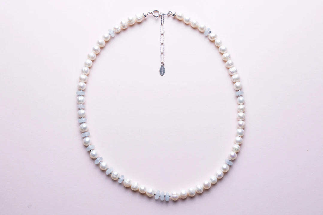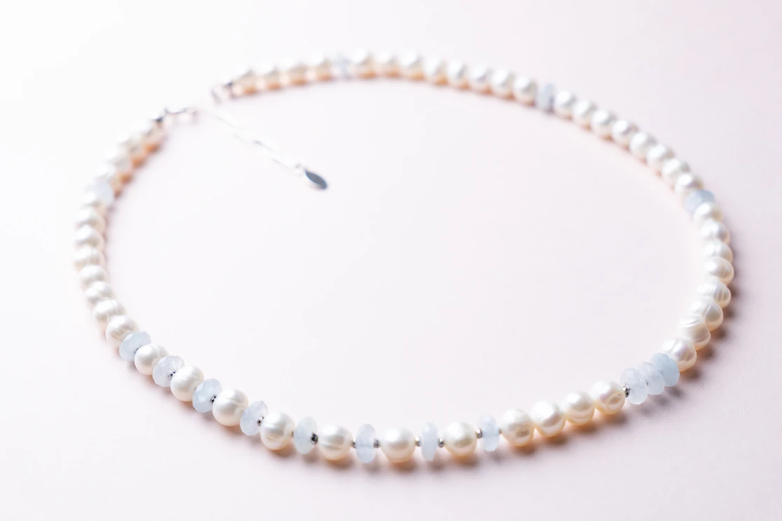 Naszyjnik „Błękitna Obecność” z perłami, akwamarynem i hematytem – talizman łagodności, siły i kobiecej obecności.