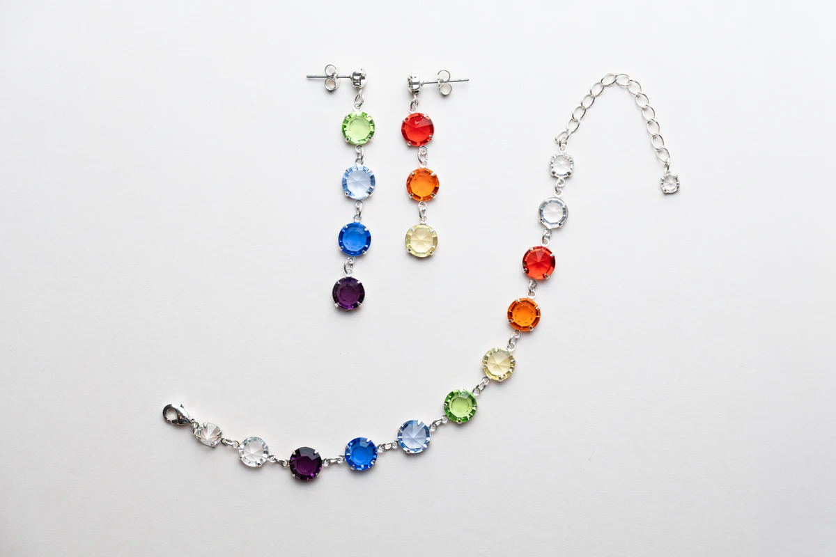 Zestaw „7 Kryształów Mocy” – kolczyki i bransoletka w kolorach siedmiu poziomów energii. Biżuteria, która wspiera harmonię i wewnętrzne światło.